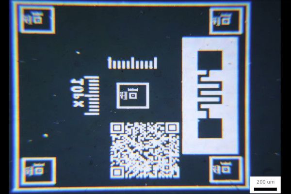 Developing the resist reveals the test pattern, which can then be transferred to the aluminium layer of the mylar with an etchant made from phosphoric, nitric, and acetic acid diluted in water. “The best result I’ve acheived so far,” Peter says, “is one where I added a QR Code and a thin-film resistor.”